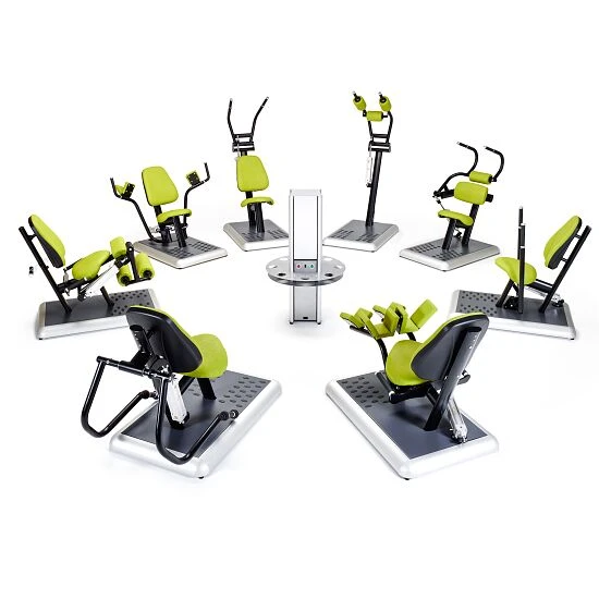 Ergänzend zu der Sport-Thieme Hydraulische Bauch-/Rücken-Maschine erhalten Sie bei uns 7 weitere hydraulische Trainingsgeräte von Sport-Thieme. Zusammen bilden sie einen Fitnesszirkel, bei dem die Sie verschiedenste Muskelgruppen ansprechen. Der gesamte Fitnesszirkel lässt sich, dank seines geringen Platzbedarfs von insgesamt 25 qm, ideal in kleineren Räumen in Fitnessstudios integrieren und stellt somit eine Komplettlösung für Group-Fitness-Kurse dar.